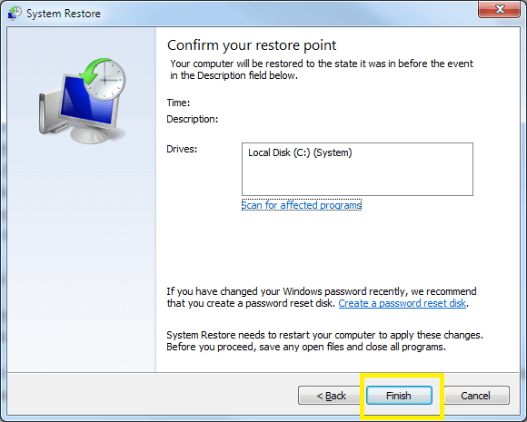 - Kalau kamu sudah yakin inginrestoreke tanggal tersebut, klik Finish dan Yeah